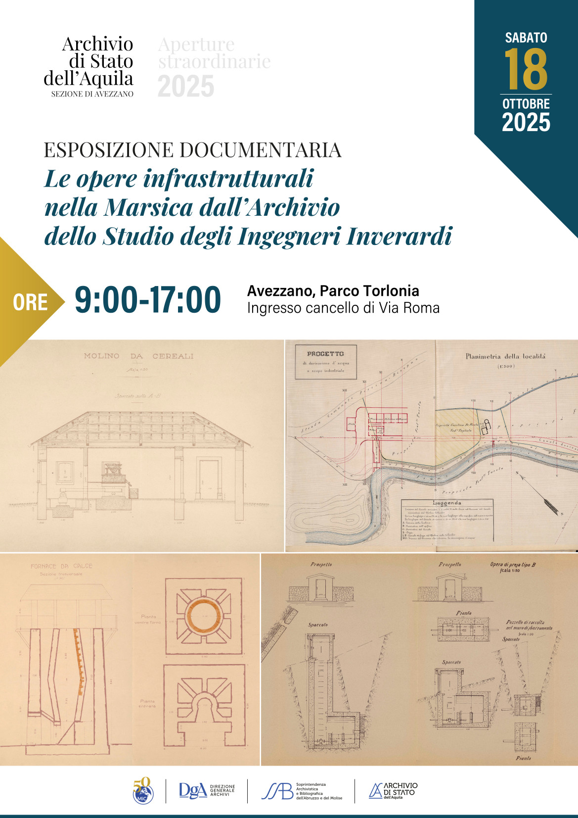 Dato il positivo riscontro di pubblico in occasione della Domenica di Carta, la Sezione di Avezzano dell’Archivio di Stato dell’Aquila ripropone, nella giornata di sabato 18 ottobre 2025, nella suggestiva cornice di Parco Torlonia, integrata in una esposizione di macchine agricole, una mostra documentaria dal titolo “Le opere infrastrutturali nella Marsica dall’Archivio dello Studio degli Ingegneri Inverardi”.