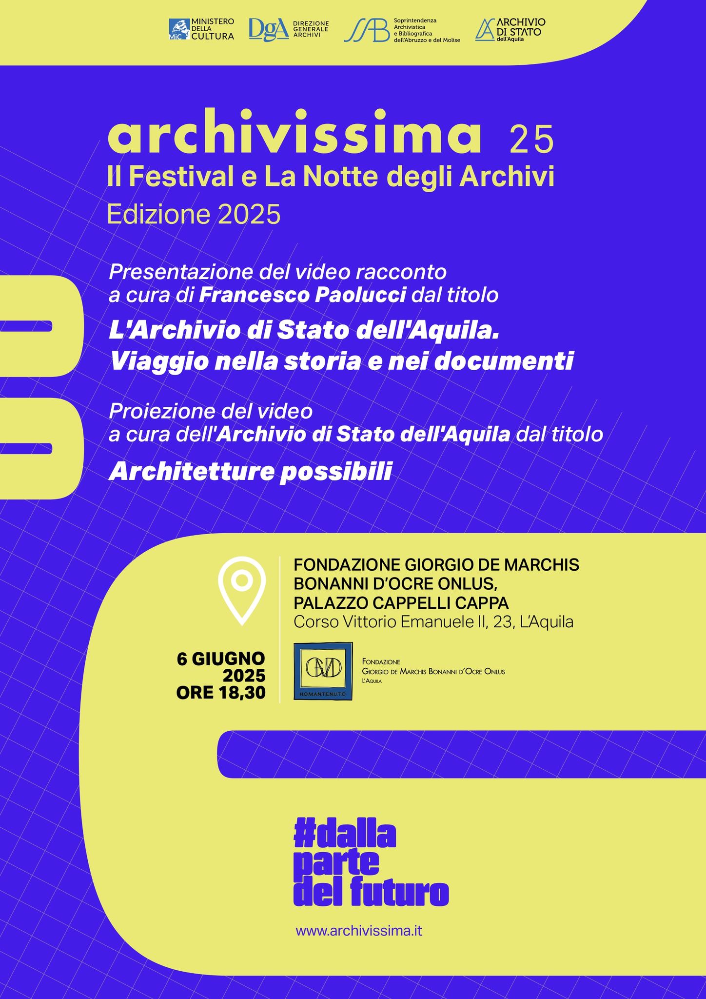 Il 6 giugno con un unico appuntamento alle ore 18,30 saranno presentati il video “Architetture possibili” e il video racconto a firma di Francesco Paolucci dal titolo "L'Archivio di Stato dell'Aquila. Viaggio nella storia e nei documenti" realizzato con fondi PNRR con la finalità di favorire la conoscenza dell’Istituto e del patrimonio che custodisce.